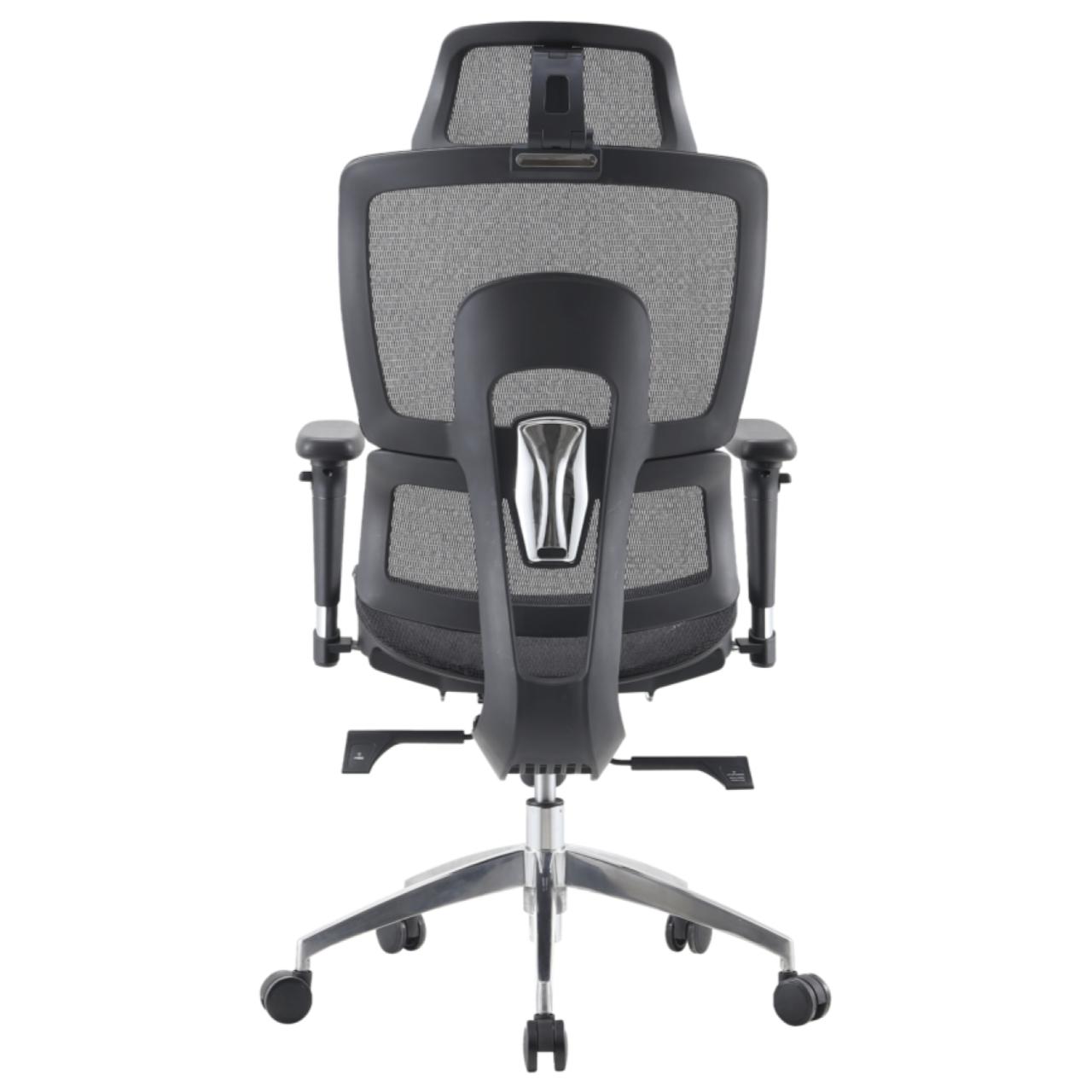 Possui um apoio lombar ajustável (visível na imagem como uma parte saliente na região inferior do encosto), permitindo personalizar o suporte para a região lombar.