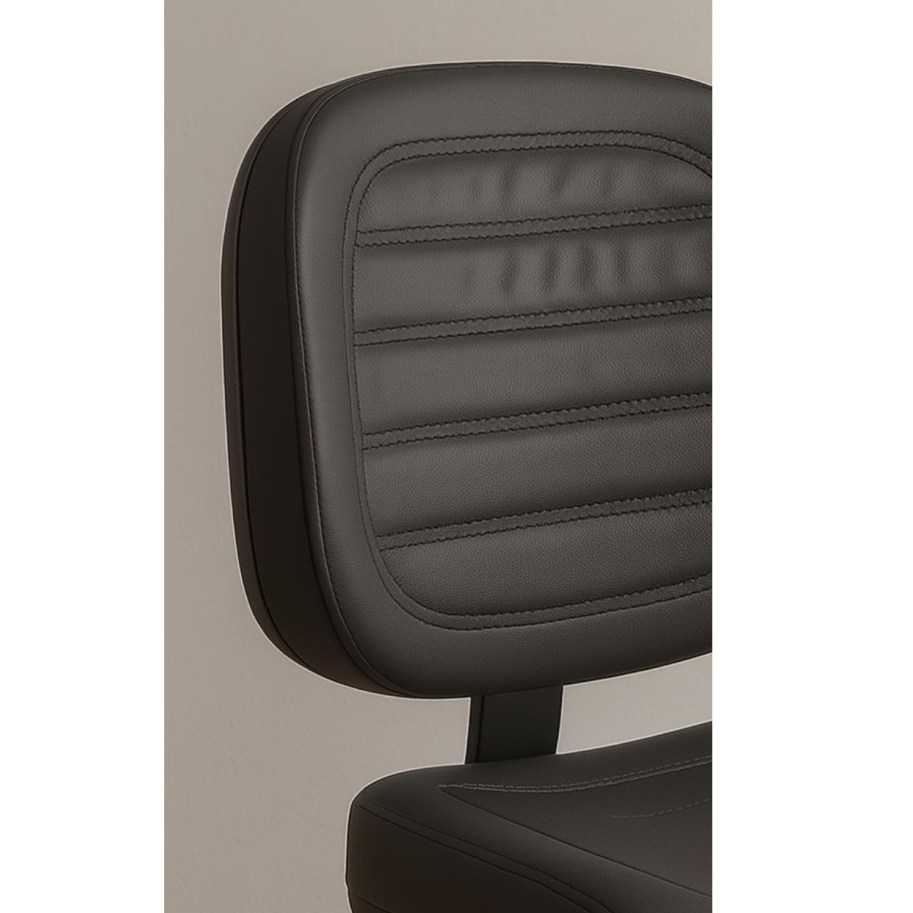 Assento e encosto revestidos em corino preto de alta resistência, fácil limpeza e acabamento sofisticado. Costura horizontal no encosto para maior valorização estética e leve apoio ergonômico.